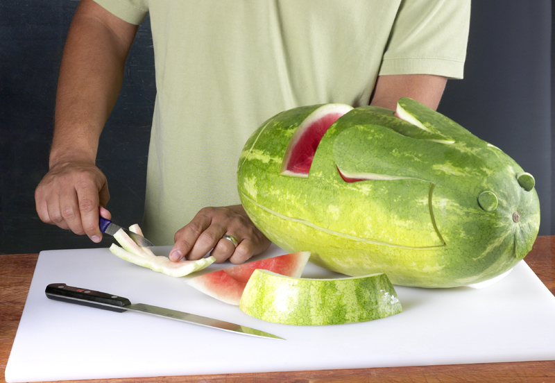 - Take an oblong watermelon and cut about 1/4" off one of the long sides to make a steady base.